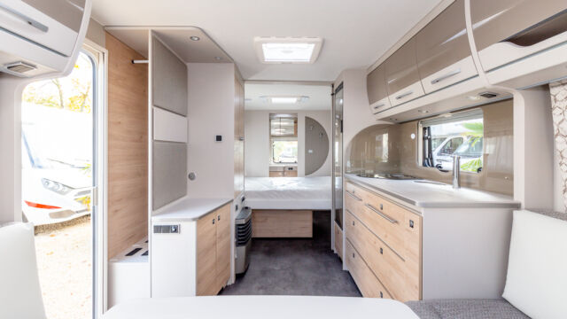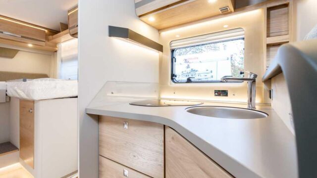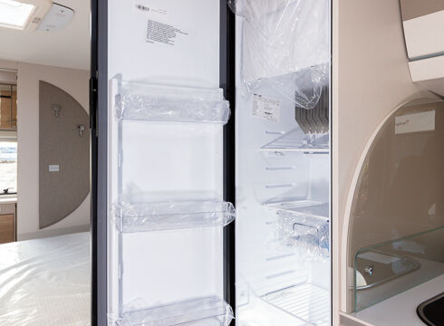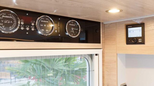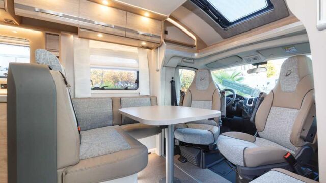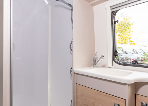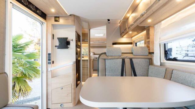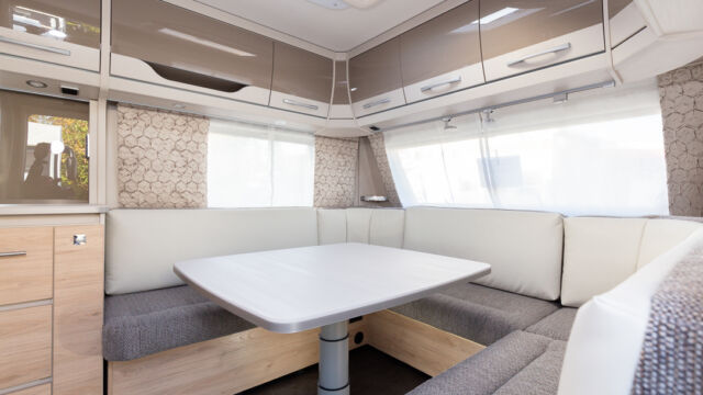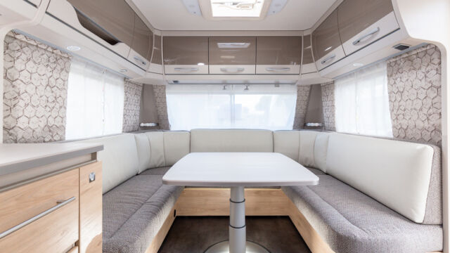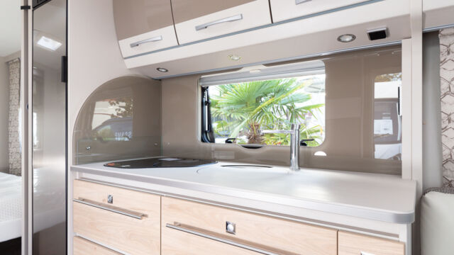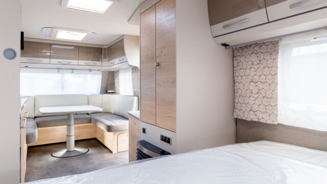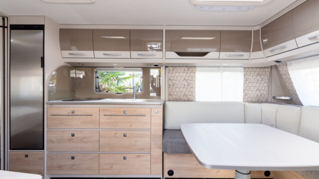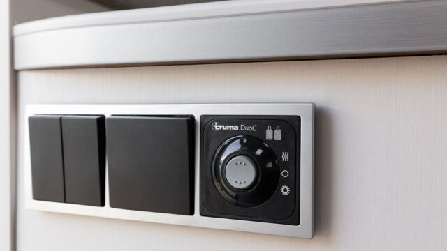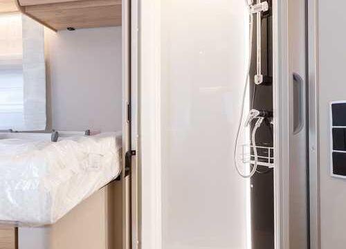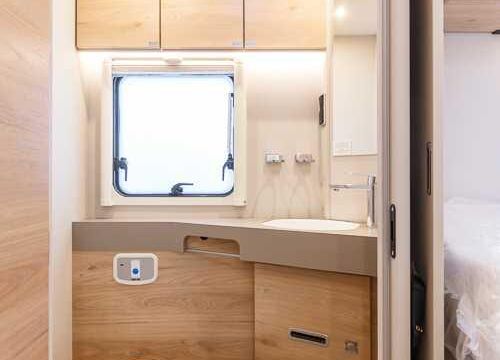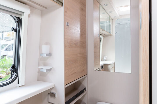 Panorama-Dachlüfter (Midi Heki), Duschraumverkleidung, Mini Heki statt MPK Dachhaube, Holzduschrost, Garderobe, Captain Chair Sitz, Überzug für Captain Chair Sitz in Wohnweltstoff, Kleiderstange in Nasszelle, 2. Steckdose im Dachschrank über Küchenblock, LED-Innenleuchte